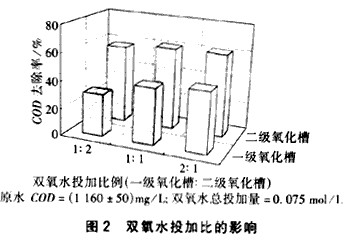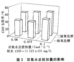 圖3表明,隨著雙氧水總投加量的增加,一級氧化槽和二級氧化槽的COD去除率均有不同程度的增加。當雙氧水總投加量增加到0.1 mol/L時,COD的去除率可達67.5%。