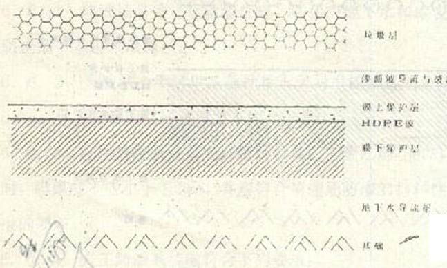 (2)防滲層,可由于土工膜和壓實黏土或GCL組成復合防滲層。土工膜選擇厚度不應小于1mm的高密度聚乙烯(HDPE)或線性低密度聚乙烯土工膜(LLDPE),土工膜上下表面應設置土工布。
