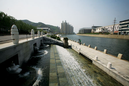 馬欄河屬于大連的季節性河流,主要功能是汛期泄洪。馬欄河污水處理廠一廠、二廠日處理污水能力20萬噸,處理了馬欄河地區每天產生的所有污水,每天處理污水后產生的中水,4萬噸用于泰山熱電廠冷卻水,4萬噸用于2號橡皮壩景觀用水,3000噸用于城市綠化噴灑用水。由于水質達到國家一級A標準,使其成為景觀用水成為可能。為此,大連市城建局在馬欄河入海口附近規劃建設了一處景觀工程,景觀工程2008年3月份建成后,不僅為市民和游客提供了一個富有情趣的近水休閑環境,還由于采用重力自流,以前向深海排放的泵站停運,除去管道維護費,每年可節電300多萬度,節省運轉費用200余萬元。出水口景觀工程的建成運行,既具有突出的環境效益,也體現出了較大的經濟效益。以此為開端,今年春天大連市又啟動了自由河景觀工程,9月1日,這一工程也竣工交付使用了。