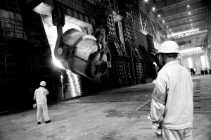 工人正在指揮吊車將鋼水倒入轉爐中 |