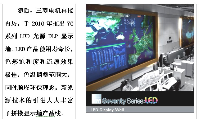 三菱電機影像系統產品家族---之---DLP拼接顯示墻。三菱電機是全球為數不多的綜合專業顯示產品供應商之一。產品范圍涵蓋專業顯示器、商業投影機、家庭與數字影院放映機、拼接顯示墻和高精度LED顯示單元,同時,三菱電機還提供以上顯示產品核心技術與零組件。其中,拼接顯示墻是三菱電機最值得稱道的產品。