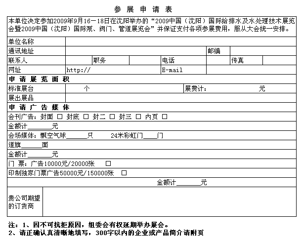 1、認真填寫《參展申請書》并加蓋參展單位公章后傳真至大會組委會,報名截止日期2009年8月30日;