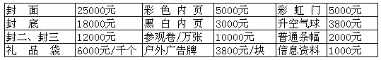 國際標準:(3M×3M)9M²展位;國內企業4800元/個;外資企業8500元/個;(包括:三面圍板、楣板文字、椅子二把、洽談桌一張、展位照明、220V電源插座一個。)注:兩面開口展位費用加收20%;