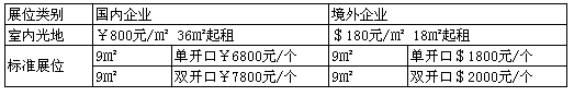 注:展位配置(標準展位9㎡配備楣板1塊、洽談桌1張、折椅2把、220v插座1個、射燈2只;室內光地不含任何展覽器材與設施。)