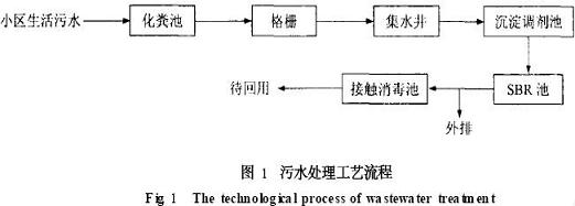生活污水經化糞池溢流通過格柵,經集水井通過提升泵進入沉淀調劑池,經沉淀調節后的出水,由泵提升進入SBR池,出水排放(或部分經過接觸消毒后回用) , 污泥由污泥泵從沉淀池和SBR池一起打入污泥池,濃縮、脫水后外運處理。此工藝設計具有占地面積小、投資少、管理簡單等優勢被業主選用,其進、出水主要指標見表1。