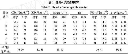 工程運行期抽查了部分運行參數,見表2。通過多次監測,其出水水質達到了( GB8978- 1996)一級排放標準。