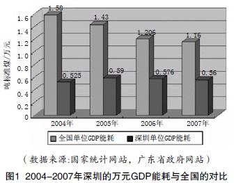 如圖1所示,2004年深圳的萬元GDP能耗還不到全國平均水平的一半。而2005年深圳的萬元GDP能耗已達到新加坡與韓國的水平,至2010年,全市單位生產總值能耗可望降到0.5噸標煤/萬元,從而達到《深圳市循環經濟發展“十一五”規劃及2020年遠景目標》[5]。