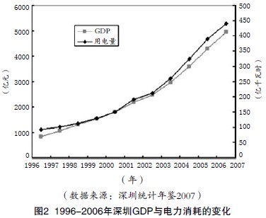 圖2為深圳市1996-2006年GDP與電力消耗的變化圖。從圖2中可知,1996-2006年,深圳GDP上升了4.87倍,電力消耗也上升了3.81倍。此期間深圳市的電力消耗對GDP增長的貢獻率與國外一些城市相比,還有相當大的差距。