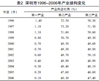 由于在產業結構中,真正消耗大量能源的是工業制造業、建筑業和交通運輸業等第二產業,而第三產業單位產值消耗的能源非常有限。表 2 為深圳市1996-2006年產業結構變化情況。