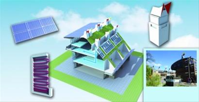利用太陽能光伏板和熱力電力轉化器收集電能供給建筑日常使用,收集的熱能將轉化為建筑制冷動力