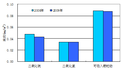 2009年,環境保護重點城市總體平均的二氧化氮濃度與上年相比持平,二氧化硫和可吸入顆粒物濃度均略有降低。