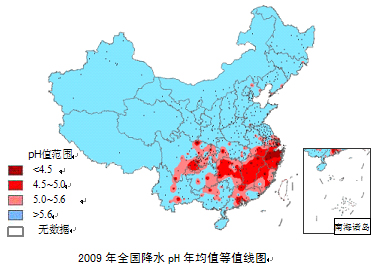 酸雨分布 全國酸雨分布區域主要集中在長江以南-青藏高原以東地區。主要包括浙江、江西、湖南、福建、重慶的大部分地區以及長江、珠江三角洲地區。酸雨發生面積約 120萬平方千米,重酸雨發生面積約6萬平方千米。與上年相比,酸雨區域分布格局未發生明顯變化。