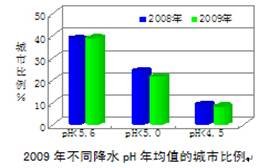 降水酸度 與上年相比,發生較重酸雨(降水pH值<5.0)的城市比例降低2.8個百分點,發生重酸雨(降水pH值<4.5)的城市比例降低0.8個百 分點。