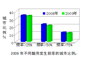 酸雨頻率 監測的488個城市(縣)中,出現酸雨的城市258個,占52.9%;酸雨發生頻率在25%以上的城市164個,占33.6%;酸雨發生頻率在75%以上 的城市53個,占10.9%。