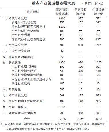 初步測算,“十二五”期間,城市污水處理、污泥處理、脫硫脫硝等重點領域環保投資約為1.2萬億元,將拉動的環保產業產值約為1.32萬億元,環保設施的運行費用3415億元,其中“十二五”期間新增運行費用 1612億元。