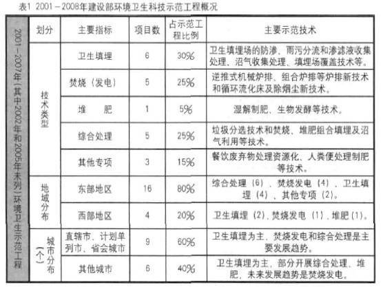 從(cong)2001年(nian)(nian)(nian)(nian)開始到2008年(nian)(nian)(nian)(nian),建設(she)部(bu)(bu)納入年(nian)(nian)(nian)(nian)度(du)(du)科(ke)技(ji)計劃(hua)實施的(de)“建設(she)部(bu)(bu)環境衛(wei)生科(ke)技(ji)示范(fan)(fan)工(gong)程(cheng)” (以下簡(jian)稱“示范(fan)(fan)工(gong)程(cheng)”) 共計 20項(xiang)(xiang)(xiang)。除(chu)去(qu)未列“示范(fan)(fan)工(gong)程(cheng)”的(de)2002年(nian)(nian)(nian)(nian)和2005 年(nian)(nian)(nian)(nian)兩(liang)個年(nian)(nian)(nian)(nian)度(du)(du),建設(she)部(bu)(bu)平均每年(nian)(nian)(nian)(nian)列“示范(fan)(fan)工(gong)程(cheng)” 項(xiang)(xiang)(xiang)目3項(xiang)(xiang)(xiang)。從(cong)技(ji)術(shu)(shu)類(lei)型(xing)看(kan),衛(wei)生填(tian)埋技(ji)術(shu)(shu)類(lei)6項(xiang)(xiang)(xiang),占(zhan)(zhan) 30%;焚燒技(ji)術(shu)(shu)類(lei)5 項(xiang)(xiang)(xiang),占(zhan)(zhan)25%;堆肥技(ji)術(shu)(shu)類(lei)1 項(xiang)(xiang)(xiang),占(zhan)(zhan)5 %;綜合處理技(ji)術(shu)(shu)類(lei)5 項(xiang)(xiang)(xiang),占(zhan)(zhan) 25 %;其它(ta)專項(xiang)(xiang)(xiang)技(ji)術(shu)(shu)類(lei)3 項(xiang)(xiang)(xiang),占(zhan)(zhan)15 %。基本(ben)覆蓋了我國垃(la)圾處理發展的(de)各個技(ji)術(shu)(shu)類(lei)型(xing)(見表1)。