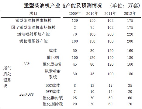 2010年將實施柴油機國IV標準,目前重型柴油機生產企業已有近139種國Ⅳ產品通過了環保型式核準,主要采用高壓共軌/單體泵+選擇性催化還原(SCR)尾氣后處理技術。產能方面,以2008年129萬臺重型柴油機產量為基數,預計2010-2012年市場需求量將分別達到 150萬臺、162萬臺和175萬臺。重型柴油機尾氣后處理裝置技術成熟,但由于政策不明朗,企業未積極擴大產能。相關產業鏈的產能及預測情況見下表。