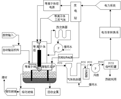 一般而言,其工作流程如下:首先是進料系統將廢物輸進等離子體主反應腔,然后在主反應腔中經歷等離子體氣化/玻璃化過程,其中金屬和玻璃體經金屬玻璃體收集系統得到收集,如果存在二次燃燒室氣體進入二次燃燒室,然后氣體進入尾氣處理系統,最后排放的氣體達到標準。如果有能量回收利用系統,氣體還要通過能量回收利用。圖5為系統工作流程圖。