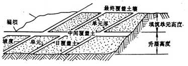 固體廢物經過減量化和資源化處理后,剩余下來的無再利用價值的殘渣,往往富集了大量的不同種類的污染物質,對生態環境和人體健康具有即時性和長期性的影響,必須妥善加以處置。安全、可靠地處置這些固體廢物殘渣,是固體廢物全過程管理中的最重要環節。衛生土地填埋通常是每天把運到土地填埋場的廢物在限定多區域內鋪40~75cm的薄層,然后壓實以減少廢物的體積,并在每天操作之后用一層15~30cm的土壤覆蓋、壓實。廢物層和土壤覆蓋層共同構成一個單元,即填筑單元。具有同樣高度的一系列相互銜接的填筑單元構成一個升層。完成的衛生土地填埋場是由一個或多個升層組成的。當土地填埋達到最終的設計高度之后,再在該填埋層之上覆蓋一層90~120cm的土壤,壓實后就得到一個完整的衛生土地填埋場。衛生土地填埋場剖面圖如圖所示。