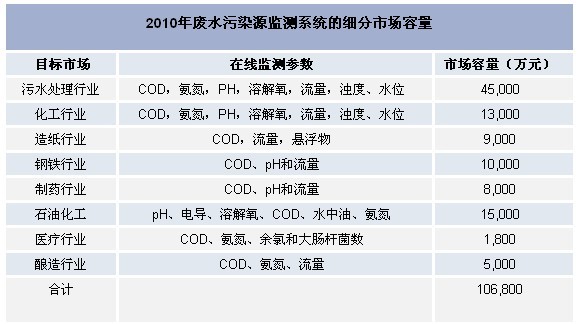 下面是2010年廢水污染源監測系統的細分市場容量表: