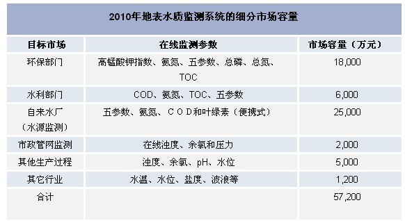 下表是2010年地表水質監測系統的細分市場容量: