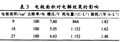 (3)電極面(mian)積(ji)的影響。實驗研究了電極面(mian)積(ji)對電解效(xiao)果的影響。如表3所(suo)示。通過電解槽(cao)的總電流不變,增(zeng)大電極面(mian)積(ji)使電流密度降(jiang)低。槽(cao)壓下降(jiang),能(neng)耗(hao)降(jiang)低。