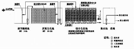 因綜合污水的水質較為復雜,在前設立調節隔渣池,后接初級沉淀系統,以確保后續工藝的順利進行,且如遇突發情況還能起到抗負荷沖擊的作用。通過除渣并均勻混合后的污水由水泵提升至厭氧池處理進行厭氧生化處理,厭氧生化池內裝放填料,并加入高效優勢菌種。厭氧微生物附著于填料的表面生長,當廢水推流通過填料層時,在填料表面的厭氧生物膜作用下,廢水中的有機物被降解,并產生少量沼氣,沼氣從池頂部溢出。第一級厭氧生化池對于廢水中的COD去除率能達到60%-80%。第一級厭氧生化處理后的一部分廢水通過格柵沖洗泵返回對調節隔渣池和厭氧生化池的格柵網進行沖洗,另一部分廢水通過工藝控制泵提升后進入第二級綜合生化池。