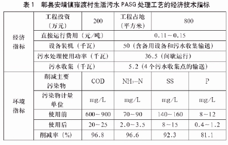 經該技術處理的生活污水出水COD等主要指標優于V類水體水質排放標準。處理費用為0.1~0.15元/m³,比采用常規技術的0.55~0.60元/m³低許多。若以一10000m³/日污水處理項目計算,每年就可以節省費用150萬元,加上中水就地回用,其經濟效益和社會效益是明顯的。其它水處理工藝也可建成地埋式工程,但投資及運行成本偏高,如采用 A/O 法處理“中國第一水鄉”周莊古鎮生活污水的地埋式工程,投資成本為8714元/噸,污水處理成本為 0.931 元 / 噸。郫縣安靖鎮雍渡村生活污水 PASG 處理工藝的經濟技術指標見表 1。PASG 工藝處理雍渡村生活污水的投資為 2000 元 / 噸,直接運行費僅為 0.11 ~ 0.15 元 / 噸,經濟效益極為顯著。化學需氧量(COD)、氨氮(NH3-N)、懸浮物(SS)和總磷(P)的去除率分別達到 96.8%、96.6%、92.3%和 81.1%。正常運行期間,可以減少化學需氧量的排放約為 282.87t/a、懸浮物約為 51.10t/a、氨氮約為 28.12t/a、總磷約為 3.36t/a。雍渡村生活污水 PASG 處理工程對減少污染物排放量、節約土地資源、減輕小流域水環境污染、改善農村生活環境質量起到了積極的推動作用。