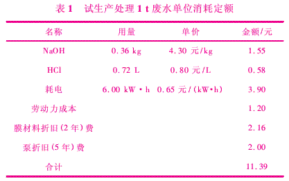 根據生產性試驗結果,處理1t含鎳電鍍廢水單位消耗定額見表1。