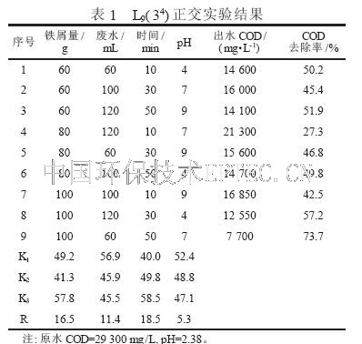 為盡快確定最佳工藝條件和影響處理效率的主要因素, 選取鐵屑質量(m) 或廢水體積(V) 、曝氣時間(t) 、pH 等因素, 每一因素各選三個水平套用正交表L9( 34) 進行正交試驗〔8〕, 結果見表1。