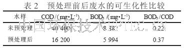 在鐵屑質量為100 g、曝氣時間50 min、廢水體積為60 mL 的條件下用鐵- 氧電池進行預處理, 結果表明可生化性(BOD5/COD) 由難生化(0.22) 提高至可生化(0.37) , 廢水可生化性得到了較明顯的改善( 見表2) 。