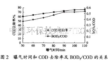 2.2.2 曝氣時間對COD 去除率和可生化性的影響從表1 中的極差分析可知, 處理時間越長COD去除率越高, 為進一步確定最佳處理時間, 又進行了單一因素試驗。在鐵屑質量100 g 和廢水體積60 mL條件下, 考察了曝氣時間對處理效果的影響, 結果見圖2。