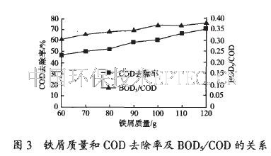 2.2.3 鐵屑質量對COD 去除率和可生化性的影響在處理時間為50 min 和廢水體積為60 mL 的條件下, 改變鐵屑質量對廢水進行預處理, 結果見圖3。