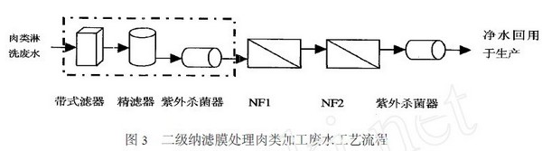 香腸淋洗水的廢水通過50μm 過濾→3μm 過濾→UV 殺菌→二級NF 膜處理后,一級和二級NF 對前三項污染物的脫除率( %) 分別為9516 、5511 ,9012 、9111 ,6017 、6518 ,水質接近于飲用水指標,可以回用到生產[26 ] 。