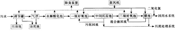 廠(chang)區含油(you)污水(shui)首先由污水(shui)泵提(ti)升(sheng)進(jin)入調節(jie)罐(guan),在罐(guan)內(nei)進(jin)行(xing)水(shui)質、水(shui)量的(de)調節(jie)。調節(jie)罐(guan)內(nei)設(she)(she)置浮(fu)(fu)動環流(liu)收(shou)油(you)器,初(chu)步去除(chu)(chu)污水(shui)中(zhong)(zhong)的(de)浮(fu)(fu)油(you)。調節(jie)罐(guan)內(nei)的(de)水(shui)由水(shui)泵均勻送入溶氣(qi)氣(qi)浮(fu)(fu)設(she)(she)備,以有(you)效(xiao)地去除(chu)(chu)水(shui)中(zhong)(zhong)的(de)浮(fu)(fu)油(you)、乳(ru)化(hua)油(you),保證后續生(sheng)化(hua)處(chu)(chu)理(li)(li)和膜(mo)(mo)分(fen)離(li)(li)處(chu)(chu)理(li)(li)效(xiao)果。污水(shui)經氣(qi)浮(fu)(fu)處(chu)(chu)理(li)(li)后依次(ci)進(jin)入水(shui)解酸化(hua)、一級好氧(yang)、中(zhong)(zhong)間(jian)沉淀、二級好氧(yang)和膜(mo)(mo)分(fen)離(li)(li)的(de)生(sheng)化(hua)處(chu)(chu)理(li)(li)構筑物(wu),合格水(shui)進(jin)入回(hui)用水(shui)池,經二氧(yang)化(hua)氯消毒后送工廠(chang)回(hui)用水(shui)系統。系統內(nei)散發惡臭(chou)廢氣(qi)的(de)位(wei)置采取密(mi)閉措施將廢氣(qi)收(shou)集至除(chu)(chu)臭(chou)裝置處(chu)(chu)理(li)(li),確保排放到大氣(qi)中(zhong)(zhong)氣(qi)體污染物(wu)如硫化(hua)氫、氨氣(qi)和有(you)機類等致臭(chou)物(wu)質滿足排放要求。