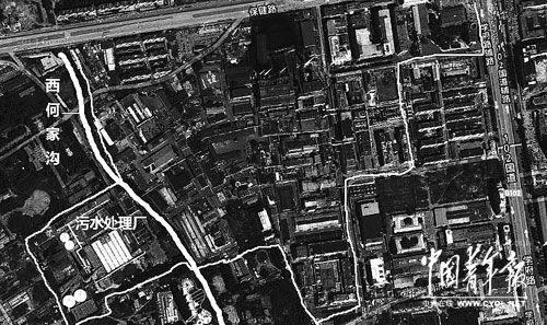 在環評報告第10頁的規劃圖上,一條被當地人稱為西何家溝的小河應該在污水處理廠的墻外。