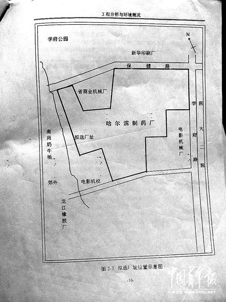 在報告書第9頁寫道:“本項目擬建于哈爾濱制藥廠廠內的空地,該空地可滿足本項目用地需要,不需另征土地。擬建于廠區西南角,北40米臨廠變電所,750米臨學府公園;南500米臨動物實驗樓,1000米臨龍江橡膠廠;西60米臨廠外空地;東1250米臨哈醫大二院。”