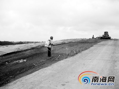 定安縣生活垃圾(ji)衛生填埋場,工(gong)作人員正給(gei)填埋好的垃圾(ji)消(xiao)毒。