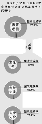 截至11月(yue)30日,陜西省共(gong)清理(li)整(zheng)(zheng)頓(dun)環保違法違規(gui)建設項(xiang)目5709個。按照類型來分,淘汰類項(xiang)目完成(cheng)率達100%,未批先建項(xiang)目3071個,已(yi)完成(cheng)清理(li)整(zheng)(zheng)頓(dun)3019個;未驗先投(tou)項(xiang)目2769個,已(yi)完成(cheng)2690個。