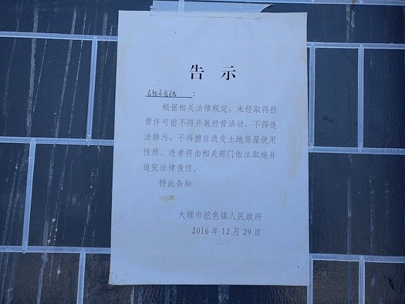 界面新聞記者在走訪洱海沿岸客棧的時候發現,已經有好幾家客棧的門口貼著白色的告示,上面寫道:“根據相關法律規定,未經取得經營許可前不得開展經營活動,不得違法排污,不得擅自改變土地房屋使用性質。”