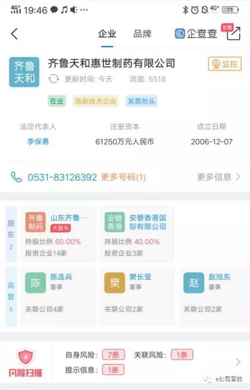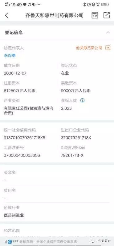企查查資料顯示,天和惠世是山東制藥龍頭齊魯制藥旗下的子公司,成立于2006年12月7日,注冊資本超過6億元,法定代表人為李保勇,實際控制人為李燕,占股26.8%。其大股東為山東齊魯制藥集團有限公司,占股60%,另一位股東為安替香港國際有限公司,占股40%。
