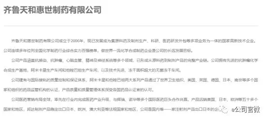 據齊魯制(zhi)藥(yao)(yao)官網資料,天和惠世集原(yuan)料藥(yao)(yao)及制(zhi)藥(yao)(yao)生產、科研、醫藥(yao)(yao)研發外包等多項(xiang)業務為一(yi)體,連(lian)續多年位列全國化學制(zhi)藥(yao)(yao)行(xing)業綜(zong)合實(shi)力百強榜(bang)單(dan),累計投(tou)資10多億人民幣。