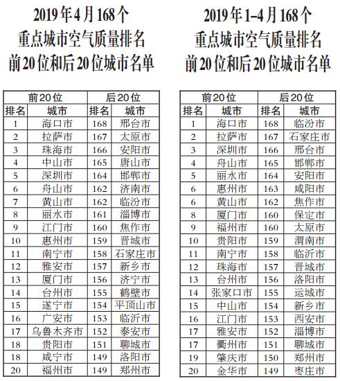 2019年1-4月,168個重點城市中臨汾、石家莊、邢臺市等20個城市空氣質量相對較差(從第168名到第149名);海口、拉薩、深圳市等20個城市空氣質量相對較好(從第1名到第20名)。
