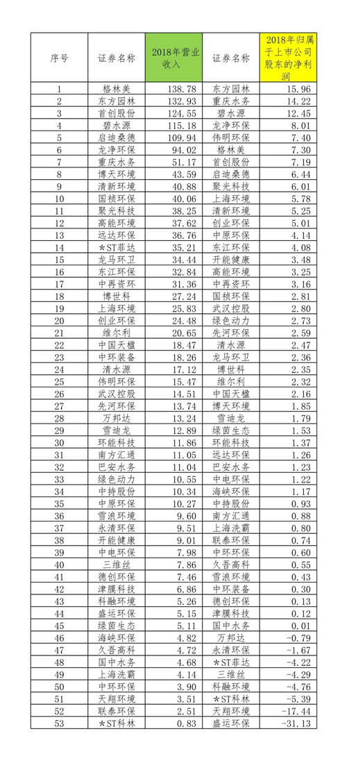 表1 53家環保上市公司2018年營業收入、凈利潤匯總表(數據來源于各公司年報)