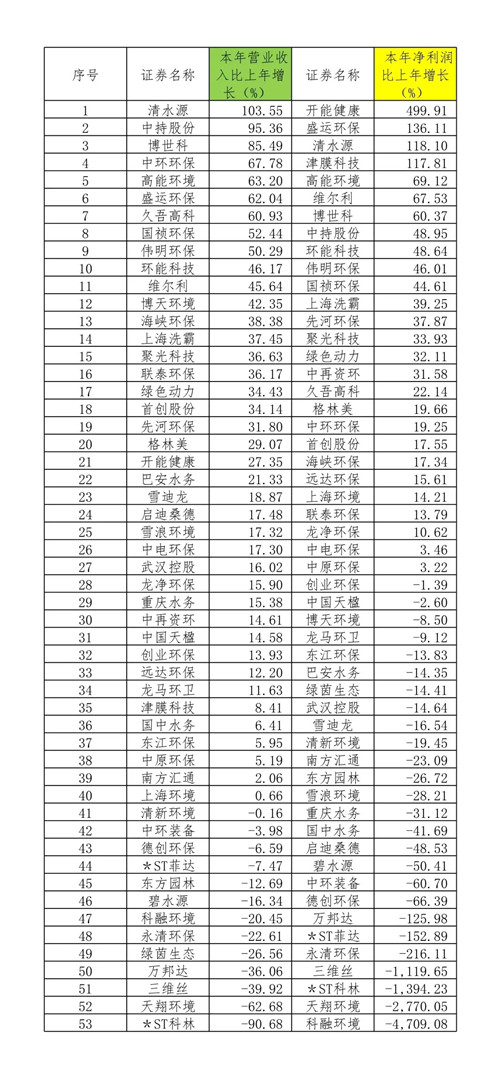 在營業(ye)收入(ru)同(tong)期增長率排行榜中(詳見表2),清水源(yuan)、中持股份和(he)博世科(ke),分別(bie)以103.55%、95.36%和(he)85.49%奪(duo)得(de)狀元(yuan)、榜眼和(he)探花(hua),*ST科(ke)林以-90.68%墊底,成為最后一名(ming)。其中,前十名(ming)被水污(wu)(wu)染(ran)防治板(ban)塊(kuai)(kuai)和(he)固廢處理(li)與(yu)(yu)資源(yuan)化板(ban)塊(kuai)(kuai)的(de)環保上(shang)市公司包攬(lan),大氣污(wu)(wu)染(ran)防治板(ban)塊(kuai)(kuai)、監(jian)測(ce)與(yu)(yu)檢測(ce)板(ban)塊(kuai)(kuai)、環境修復板(ban)塊(kuai)(kuai)的(de)企業(ye)無緣前十。