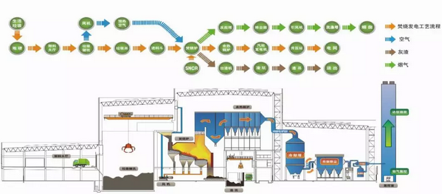 通過上圖,我們可以看到,生活垃圾由專用運輸車送至垃圾發電廠,經地磅稱重后開至卸料門,卸到垃圾儲坑內,經自然發酵(堆放5-7天),析出垃圾中的部分水量以提高熱值,期間產生的沼氣、臭氣回收至焚燒爐利用,垃圾堆存所產生的滲濾液,經處理達標后,作為全廠生產用水。發酵后的垃圾經進料斗進入高達850~1100℃的焚燒爐內,焚燒煙氣停留2s 以上,高溫有效控制二噁英的生成。垃圾在鍋爐內燃燒產生熱能,用于汽輪發電機進行發電。垃圾燃燒過程所需的助燃空氣取自于垃圾池內產生的臭氣,使垃圾池維持負壓,確保池內臭氣不會外溢。焚燒后產生的爐渣用作建筑材料,垃圾焚燒后所產生的煙氣經煙氣處理系統凈化后,有效的去除煙氣中酸性污染物,顆粒物,氮氧化物,重金屬及二惡英等污染物,達到國標或歐盟2000標準后的潔凈氣體排至大氣。在煙氣處理過程中產生的飛灰,經固化穩定后運至填埋場進行無害化填埋。