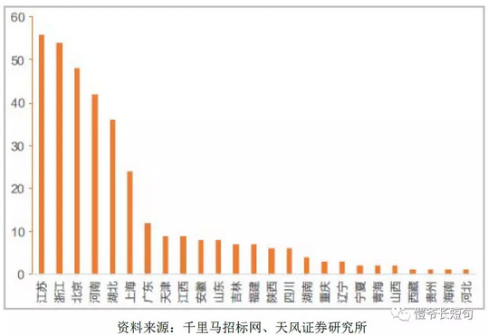 在千里馬(ma)招標網(wang)上(shang),2018年9月(yue)—2019年6月(yue)垃(la)圾(ji)(ji)分類(lei)相關訂(ding)(ding)單(dan)共352份,訂(ding)(ding)單(dan)大都(dou)屬于(yu)(yu)政府采購,采購內容(rong)主要涉及(ji)分類(lei)垃(la)圾(ji)(ji)桶、垃(la)圾(ji)(ji)分類(lei)運輸(shu)車、垃(la)圾(ji)(ji)分類(lei)督(du)導服務、中轉站(zhan)等(deng)垃(la)圾(ji)(ji)分類(lei)治理設(she)施和運營(ying)服務。分地區而言,這(zhe)些垃(la)圾(ji)(ji)分類(lei)采購訂(ding)(ding)單(dan)呈現出顯(xian)著的東(dong)部強(qiang)于(yu)(yu)西(xi)部,南方多(duo)于(yu)(yu)北(bei)方趨(qu)勢(shi)。在352份訂(ding)(ding)單(dan)中,有(you)165單(dan)位(wei)于(yu)(yu)華東(dong)區域(yu),96單(dan)位(wei)于(yu)(yu)中南區域(yu),60單(dan)位(wei)于(yu)(yu)華北(bei)區域(yu)。而西(xi)南、西(xi)北(bei)、東(dong)北(bei)地區的數(shu)量分別為11單(dan)、10單(dan)、10單(dan)。