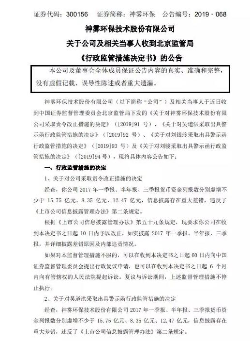 近日,神霧(wu)環保收到北京(jing)證監局的《行政(zheng)監管措(cuo)施決定書》、《警示函》等。