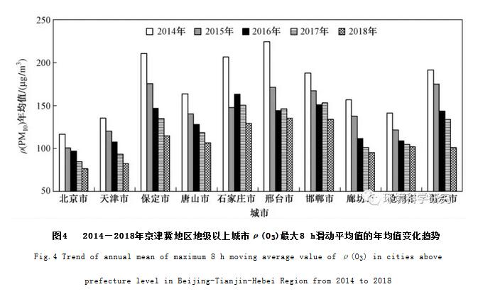 由圖3可見:2014—2018年北京市、天津市、保定市、唐山市、石家莊市、邢臺市、邯鄲市、廊坊市、滄州市和衡水市的ρ(PM10)年均值也均呈下降趨勢. 2018年北京市、天津市的ρ(PM10)年均值相對較低,分別為76、82 μg/m3;邢臺市、邯鄲市、石家莊市的ρ(PM10)年均值相對較高,分別為135、134、129 μg/m3. 總體上,京津冀地區大氣污染聯防聯控基本實現了《大氣污染防治行動計劃》所要求的2017年京津冀區域空氣質量控制目標. 然而,隨著京津冀地區顆粒物濃度的逐步下降,O3污染狀況逐漸加重. 由圖4可見,10個城市中僅有北京市和衡水市的ρ(O3)最大8 h滑動平均值的年均值基本保持不變,其他城市普遍呈逐年上升趨勢,并且邢臺市、邯鄲市、保定市相對較高.
