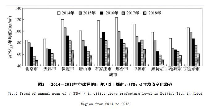 由圖2可見:2014—2018年位于京津冀及周邊地區“2+26”城市大氣污染傳輸通道上的北京市、天津市、保定市、唐山市、石家莊市、邢臺市、邯鄲市、廊坊市、滄州市和衡水市的ρ(PM2.5)年均值均呈逐年下降趨勢. 2018年,北京市、廊坊市的ρ(PM2.5)年均值相對最低,分別為50和51 μg/m3;石家莊市、邢臺市、邯鄲市的ρ(PM2.5)年均值相對最高,分別為71、72、69 μg/m3. 但目前所有城市的ρ(PM2.5)年均值仍過超GB3095—2012《環境空氣質量標準》的二級標準限值.